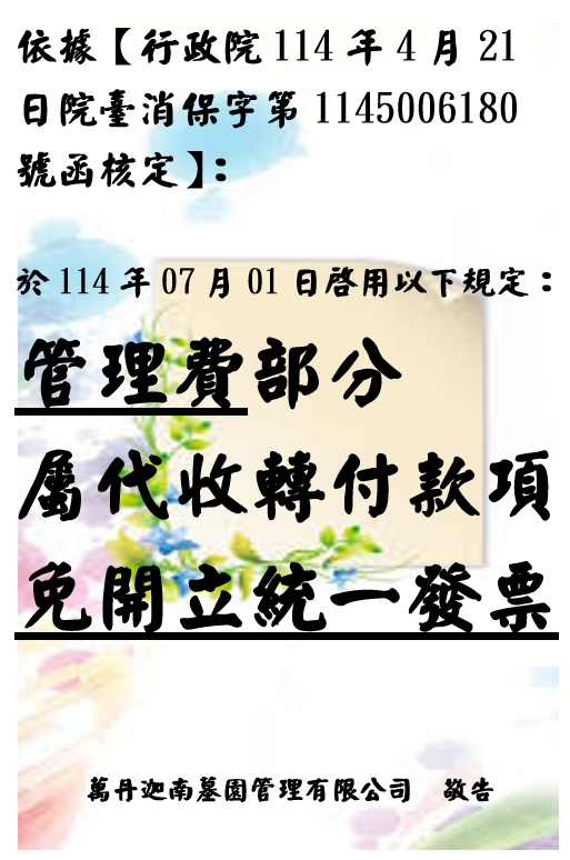 於114年07月01日啟用以下規定:「管理費部分,屬代收轉付款項,免開立統一發票。」